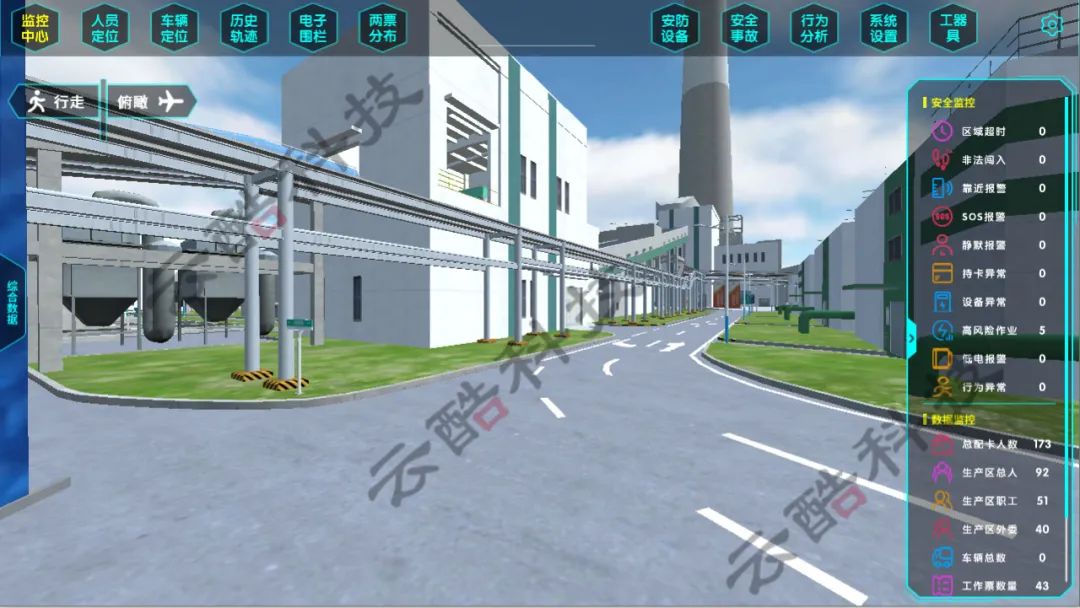 廠內需要定位的車輛配備GPS/北斗雙模定位設備,系統后臺實時監測車輛位置并在三維地圖上進行顯示,車輛定位可聯動視頻監控和歷史軌跡播放。
